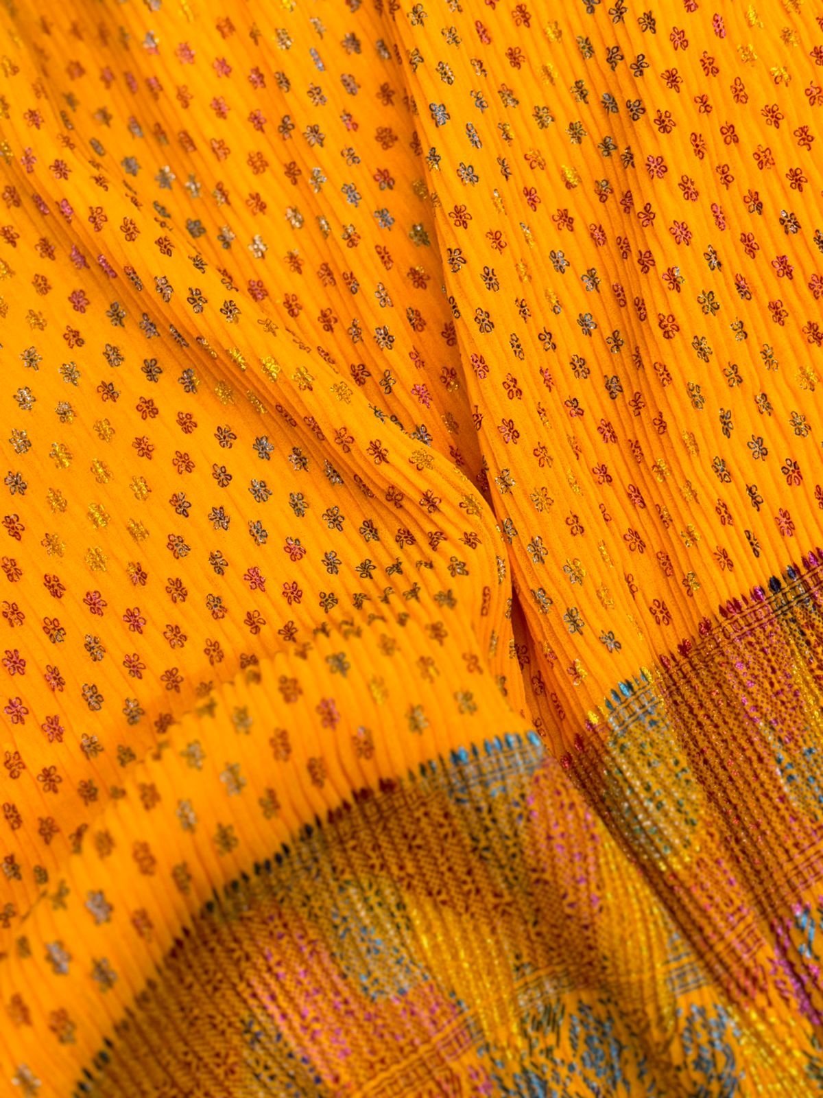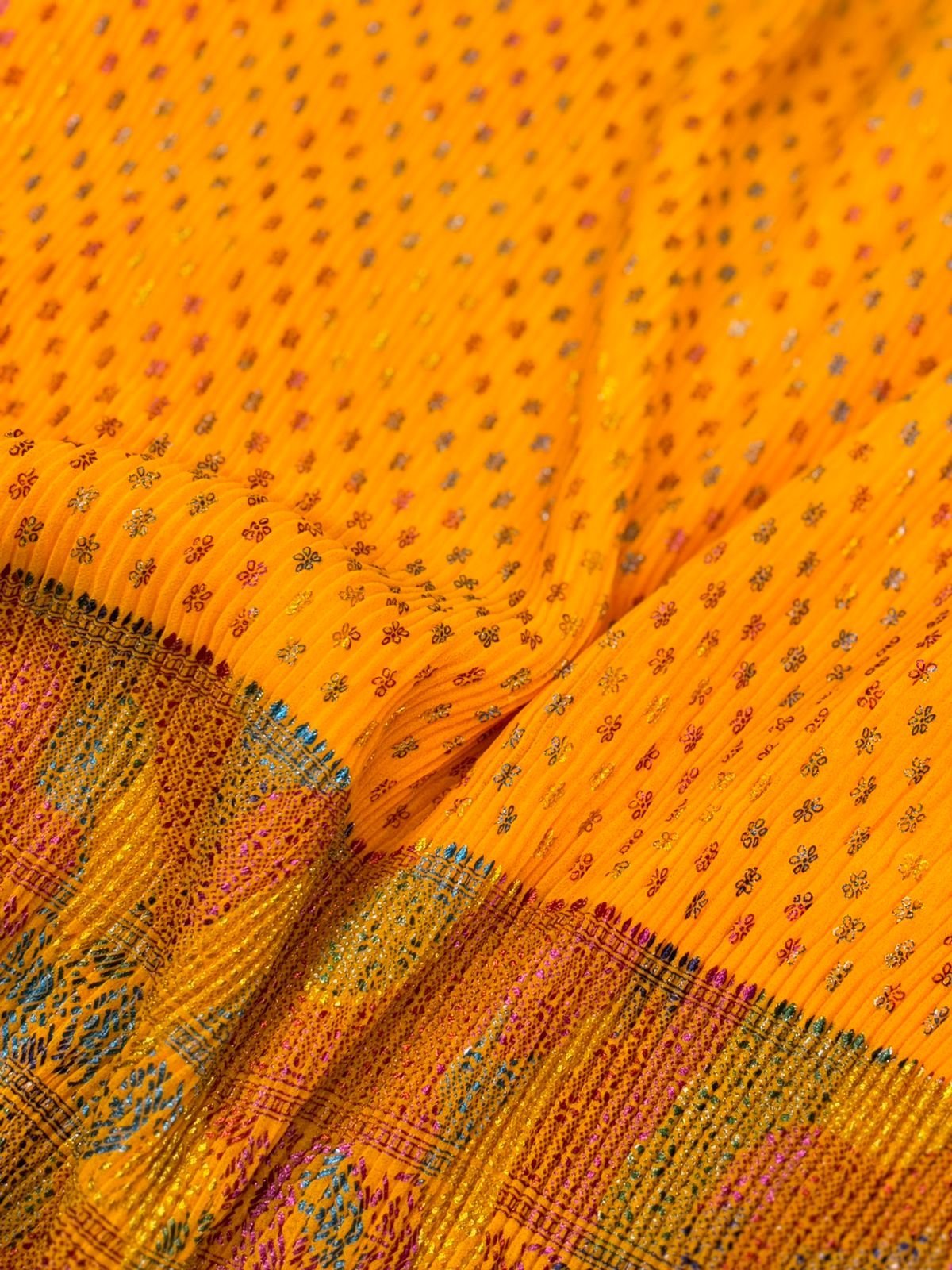Premium Pleated Georgette with stunning Rainbow Foil Work – perfect for flowy gowns, festive wear & statement outfits! 🌈💃